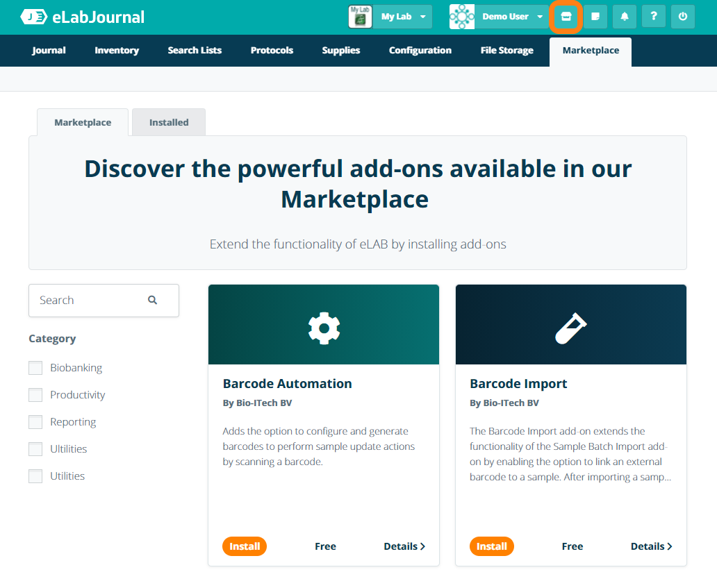 The eLabJournal offers a Marketplace with a wide range of powerful add-ons that can be installed to extend the functionality of the eLabJournal. Navigate to Marketplace to see a list of add-ons are available.