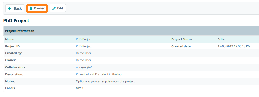 On the project details page, click the Owner button. In the pop-up window, select one of the lab members and click Change. Note: this action only affects the Project Owner field; Project Creator is a separate field and cannot be updated.