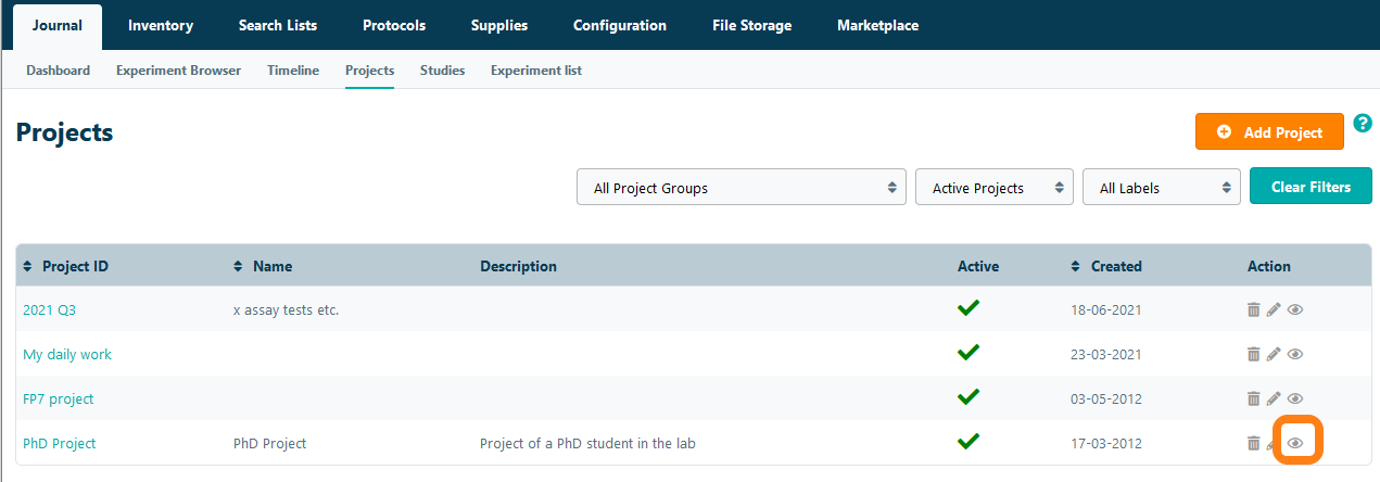 To change the owner of a project, navigate to either the Experiment Browser or Projects and click the View icon