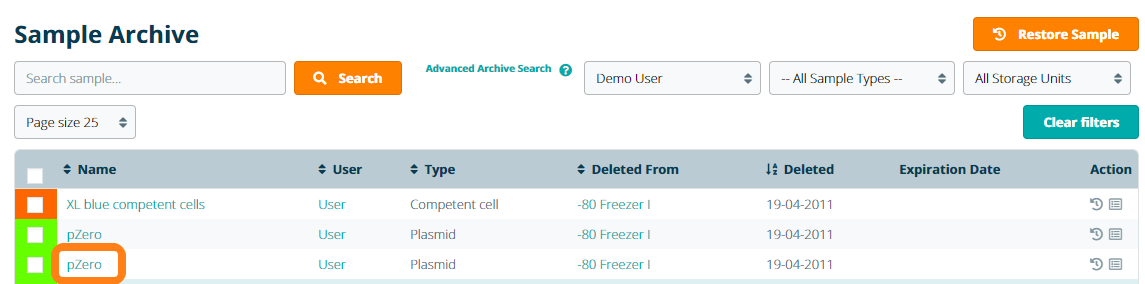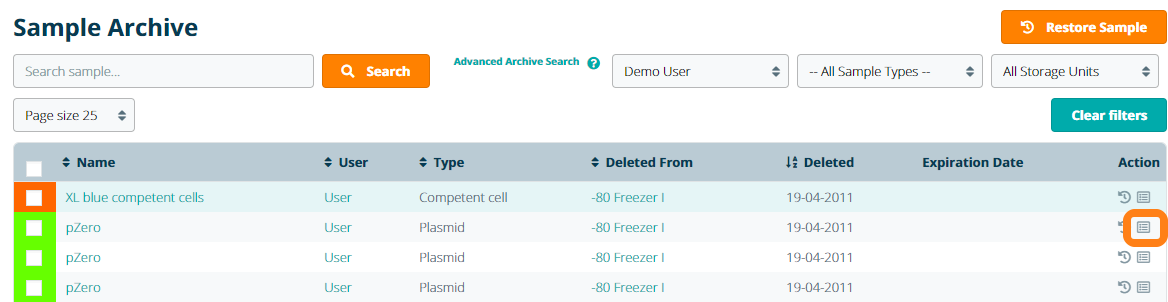 Use the keyword search bar or quick filters to find samples. Click on the sample name in the archive to view the sample information of the archived sample.