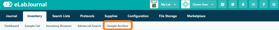 Samples that have been removed from the lab inventory are stored to the Sample Archive. Navigate to Sample Archive under the Inventory tab to view all samples that were previously stored in the lab's inventory. This ensures that any information about archived sample that might be linked in experiments will remain available.